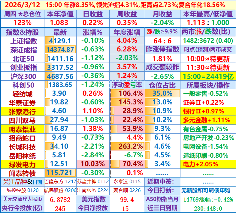 收盘,个股涨跌比2.84,两市成交额2.04万亿。账户持股10涨3跌,生物股份大涨9.11%,同华泰证券和明泰铝业居持股涨幅前三,账户本年净值本周第三次创出新高……