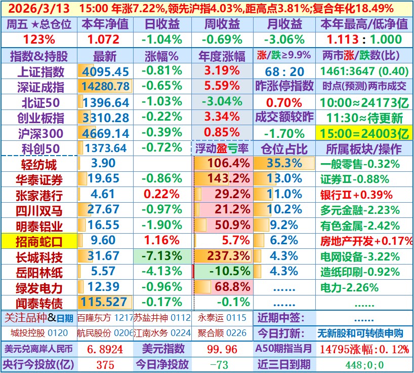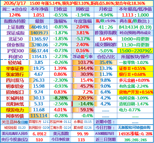 收盘,个股涨跌比0.48,两市成交额1.95万亿。账户持股6涨7跌,明泰铝业涨3.24%,涨幅居持股之首,昨日大涨的四川双马跌3.23%,今天账户净值微跌0.05%,上午11时盘中曾创出新高……