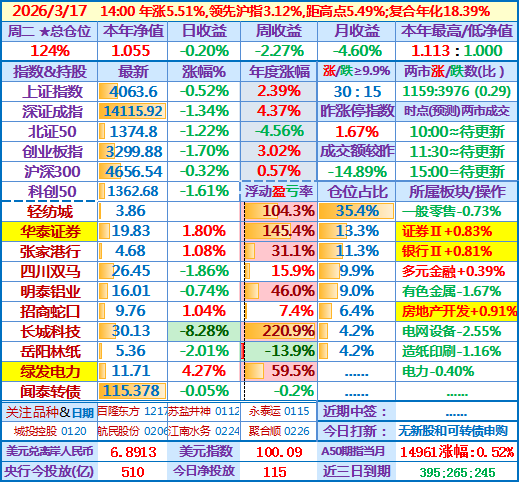 下午收盘,个股涨跌比0.28,两市成交额3.02万亿。账户日收益+1.73%,本年净值1.113,创了新高。持股5涨1平5跌,其中长城科技收获连续的第二个涨停(+9.99%),和岳阳林纸(+8.42%)、淮北矿业(+3.48%)在持股中领涨,煤炭、有色金属和银行板块在持股相关行业板块里涨幅居前……