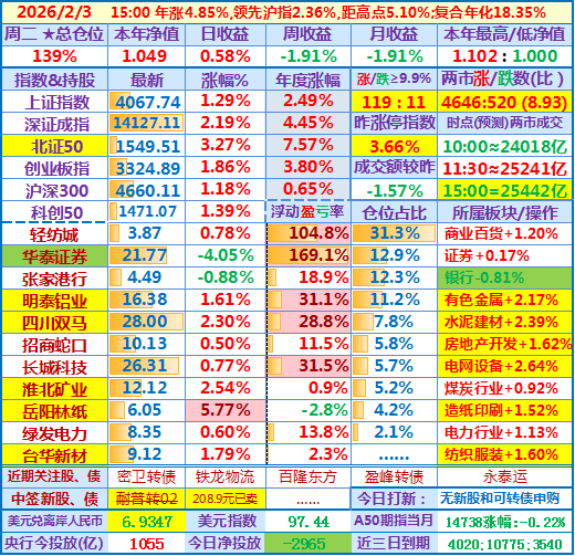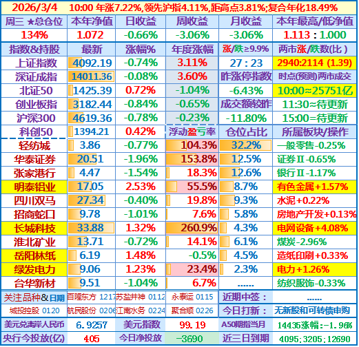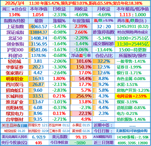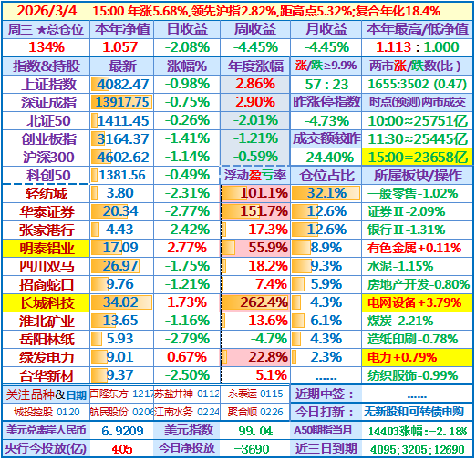 ★★2026-03-04:本年净值1.057,日收益-2.08%。仓位134%……