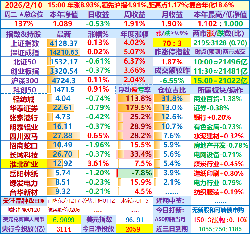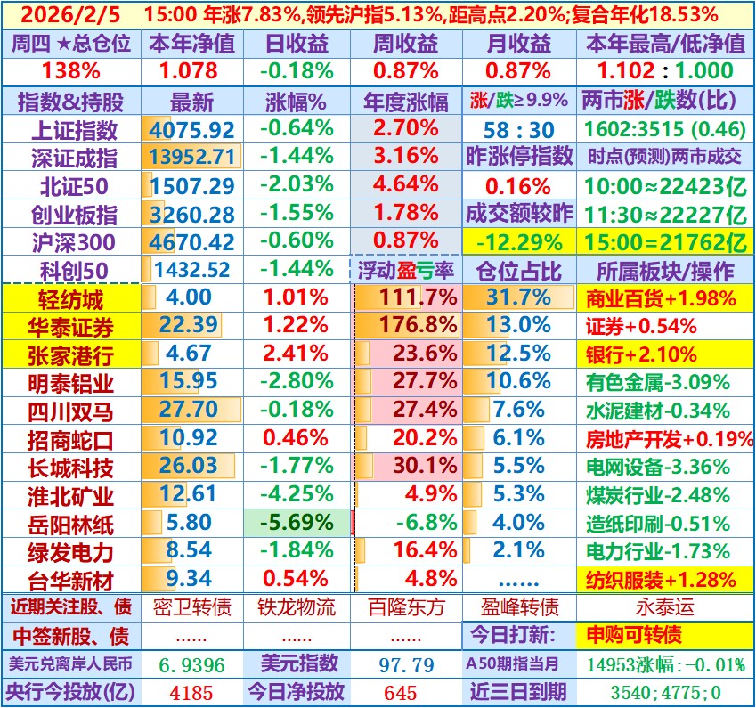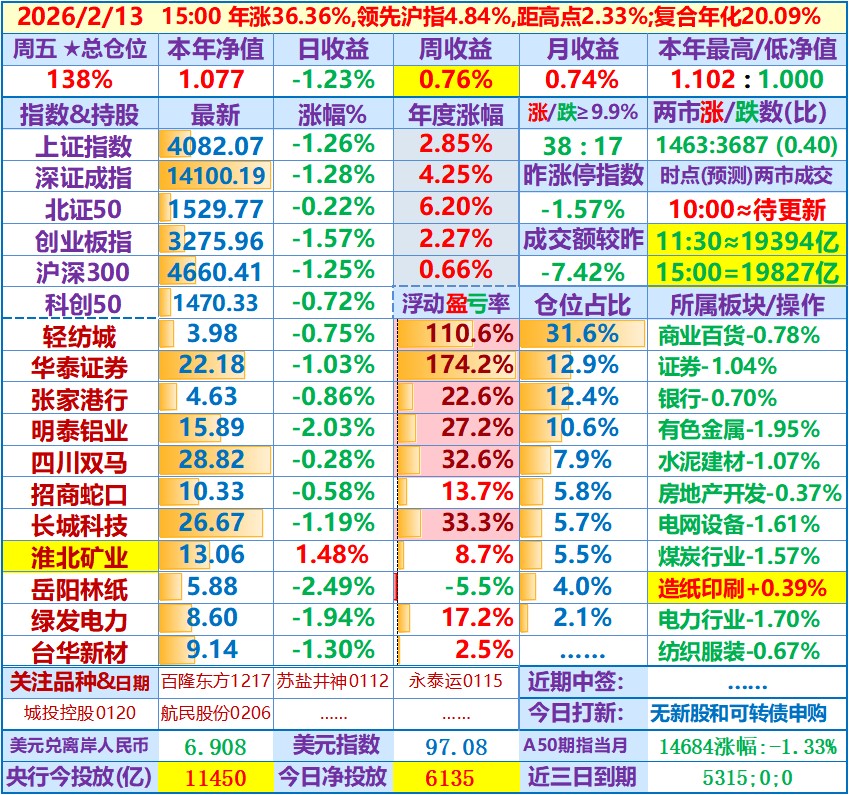 ★★2026-02-13:本年净值1.077,日收益-1.23%,周收益+0.76%。仓位138%……