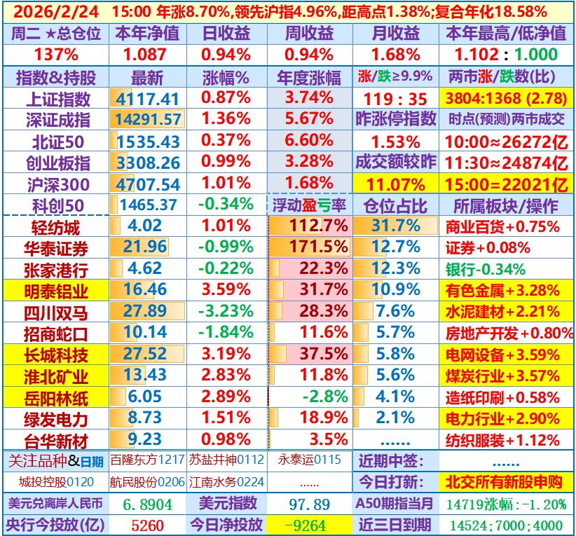 ★★2026-02-24:本年净值1.087,日收益+0.94%。仓位137%……