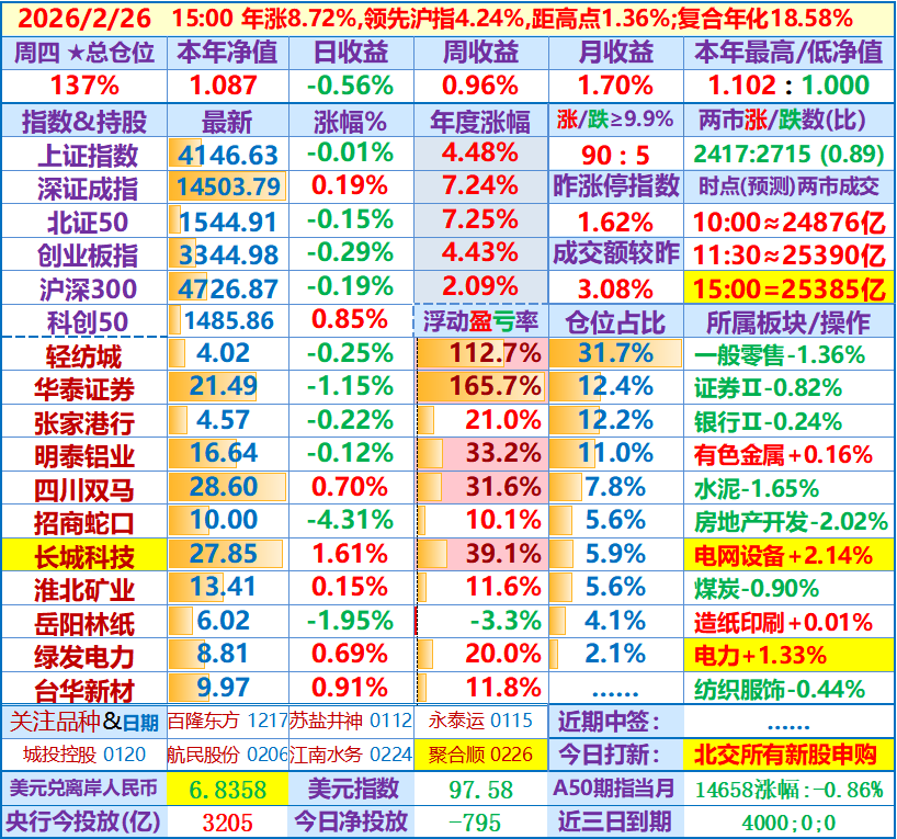 ★★2026-02-26:本年净值1.087,日收益-0.56%。仓位137%……