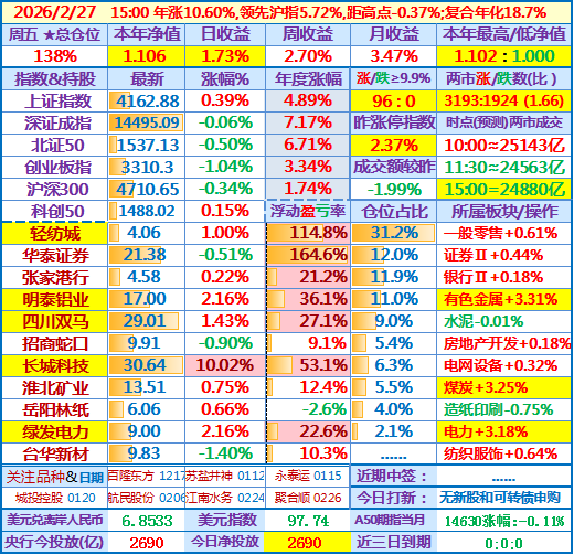 ★★2026-02-27:本年净值1.106(新高),日收益+1.73%,周收益+2.70%,月收益+3.47%,年收益+10.60%。仓位138%……
