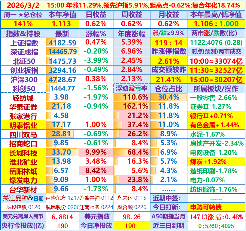★★2026-03-02:本年净值1.113(新高),日收益+0.62%。仓位141%……