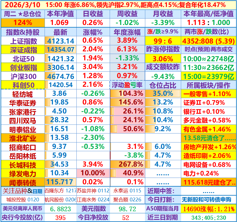 ★★操作(观察):继续持股为主,综合考虑可能逢高减仓部分长城科技,虽然昨天它的龙虎榜数据不错……申购可转债……