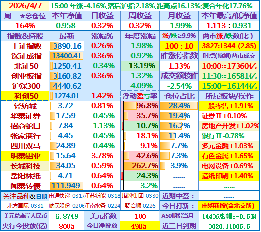 下午收盘,两市涨跌比0.16,成交额1.66万亿,日收益-2.37%。本年净值0.955,持股2涨7跌……