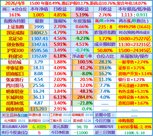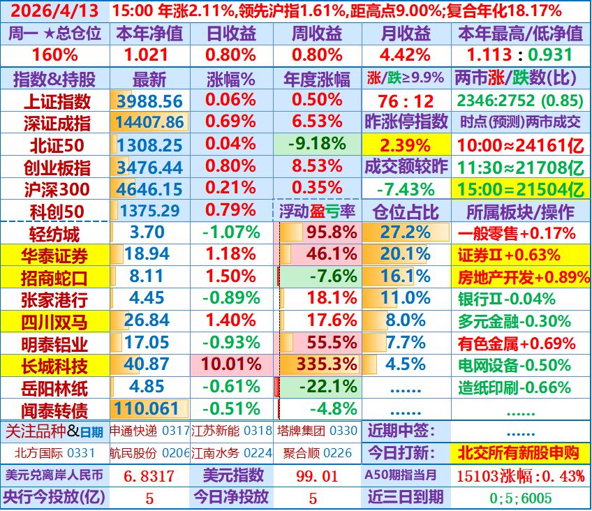 下午收盘,两市涨跌比16.61,成交额2.43万亿,日收益+4.85%。本年净值1.005,持股全部上涨,长城科技涨幅领先,并创出近几年高点36.96元……