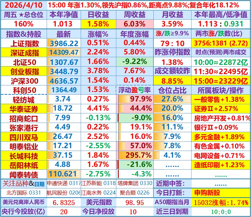 收盘,个股涨跌比4.94,两市成交额1.73万亿。持股10涨3跌,持股涨跌幅不大,持股板块依然有5个涨幅超2%,商业百货板块依旧很强。本周收官,涨幅+3.53%……