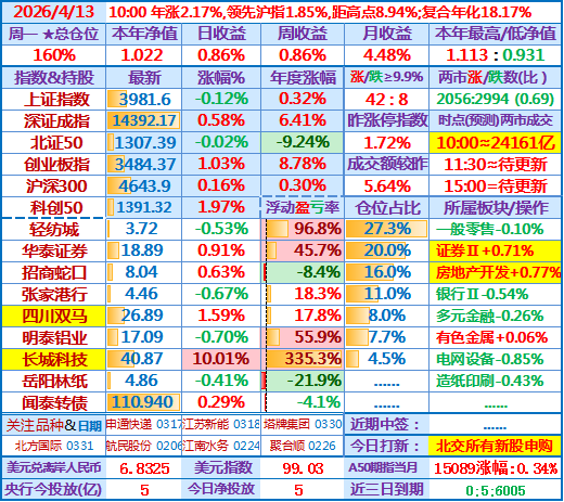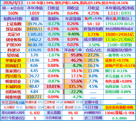 今日操作(观察):继续持股……北交所有新股申购……