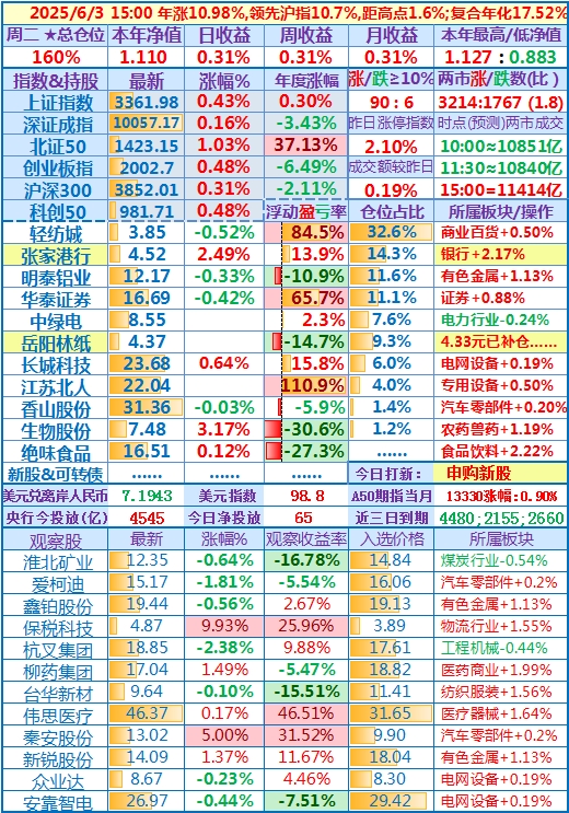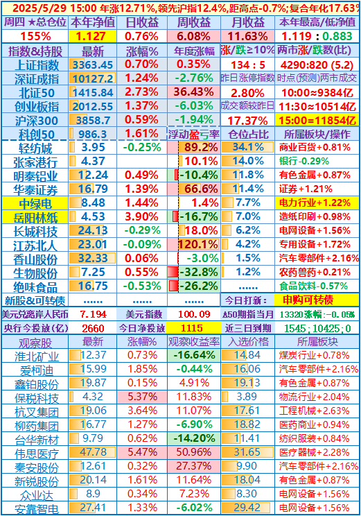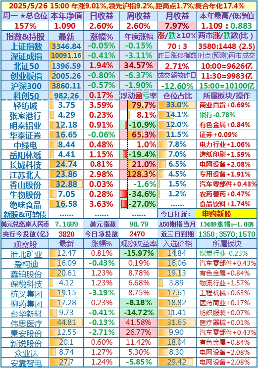 2025-05-26:本年净值1.090,日、周收益+2.60%,月收益+7.97%,年收益+9.01%,仓位157%……