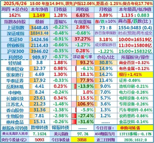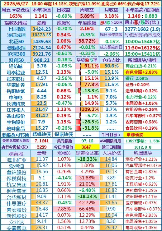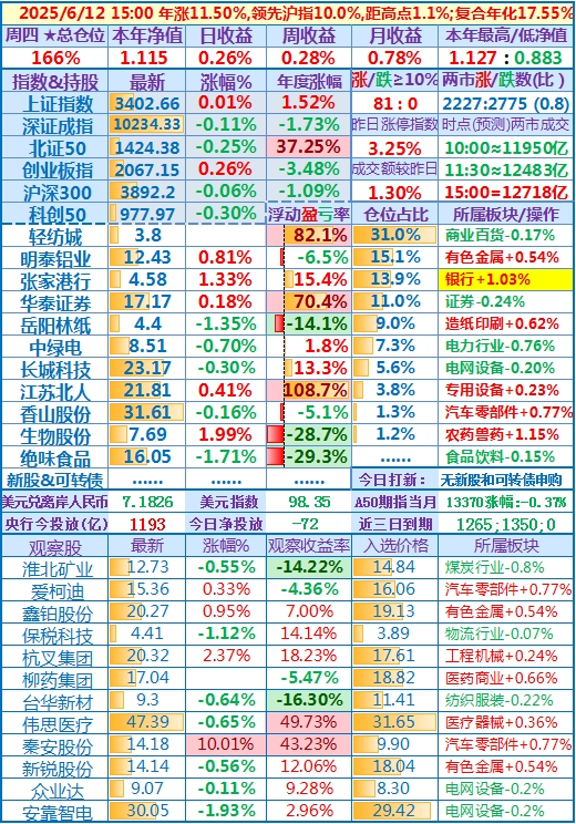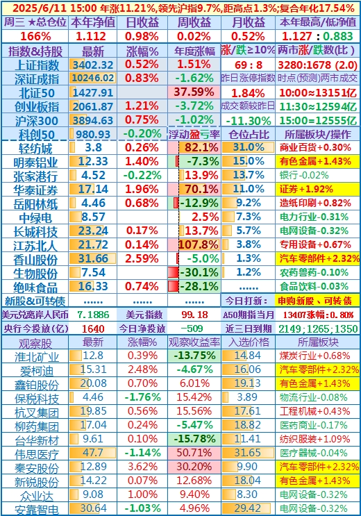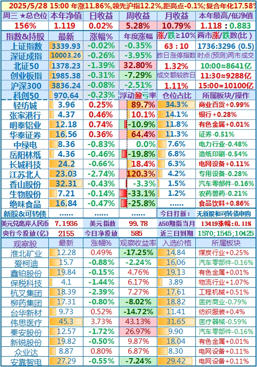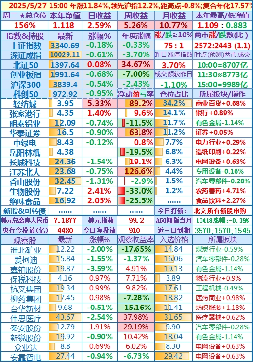 2025-05-27:本年净值1.118(本年新高),日收益+2.59,周收益+,5.26%,月收益+10.77%,年收益+11.84%,仓位156%……