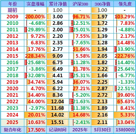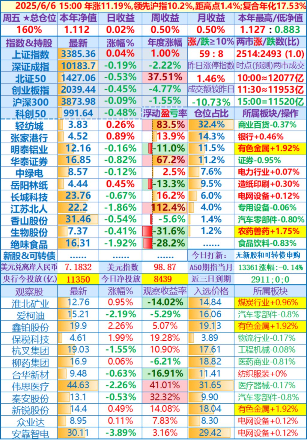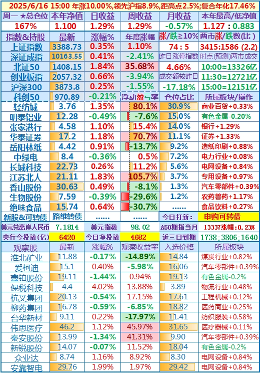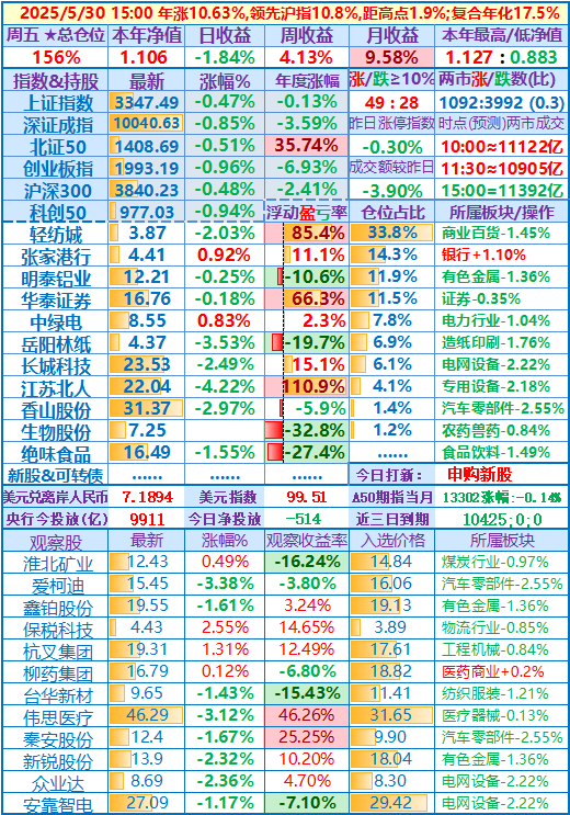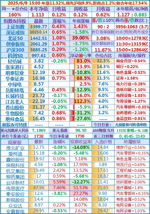 2025-05-16:本年净值1.093,日收益-0.30%,周收益+4.23%(写错了,实际是+4.13%),年收益+9.34%,仓位157%……