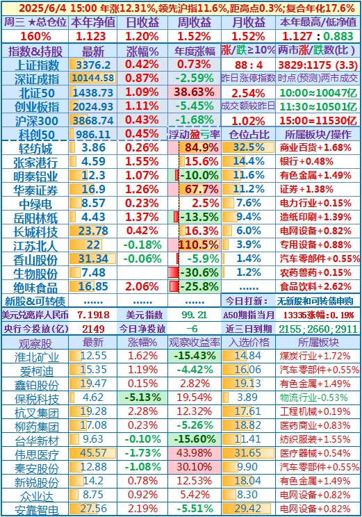 ★★操作(观察):今日有北交所新股申购;继续持股……开盘,个股涨跌比1.3,两市成交额量级约1.85万亿元……10时,个股涨跌比2.3,两市成交额量级约1.83万亿元……中午收盘,个股涨跌比4.5,两市成交额量级约1.83万亿元,持股相关板块涨幅超1%的变多了,盘中沪指创3654.96的本年新高……收盘,个股涨跌比4.0,两市成交额1.827万亿元。账户持股9涨1跌1平,涨0.9%,本年净值再创年内高点……
