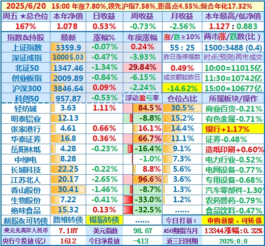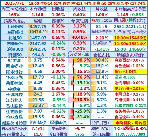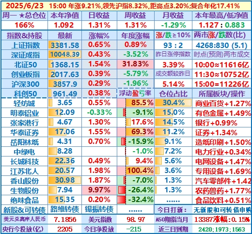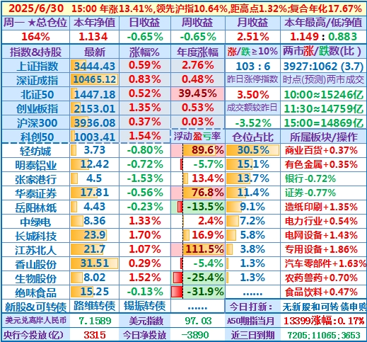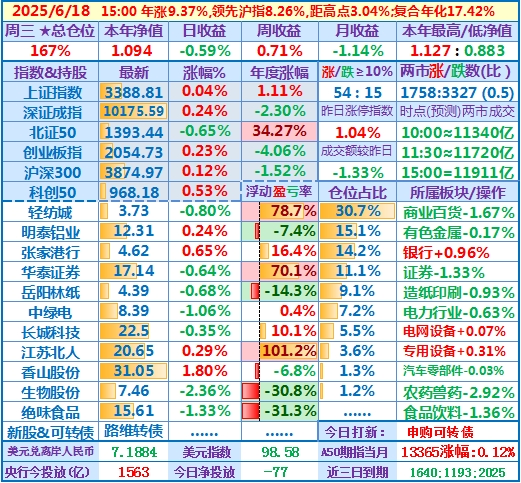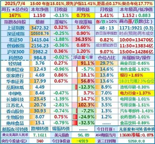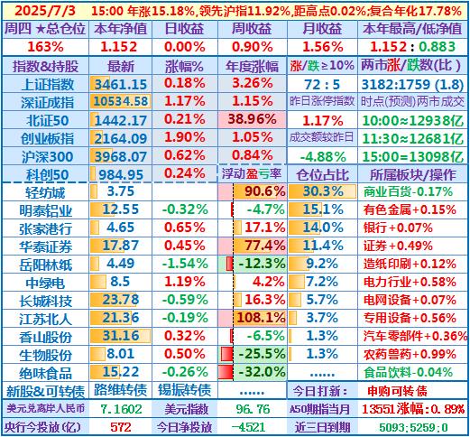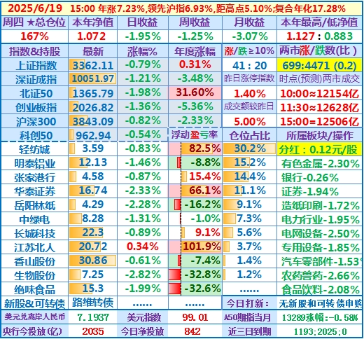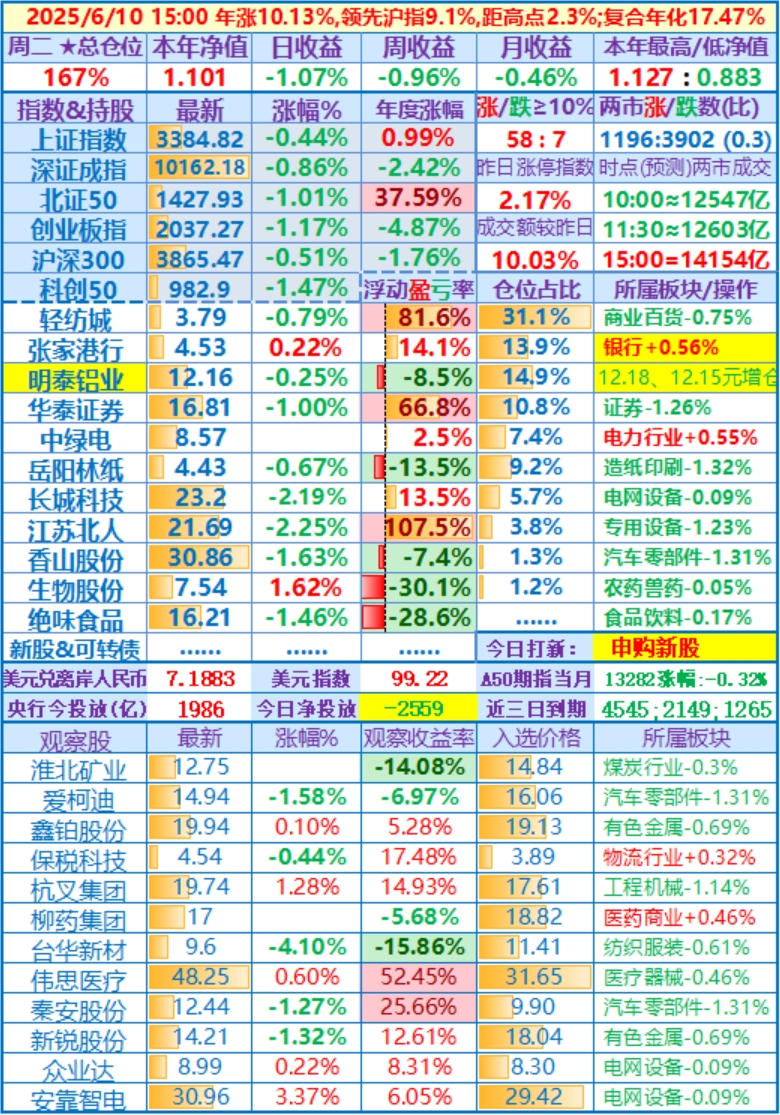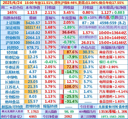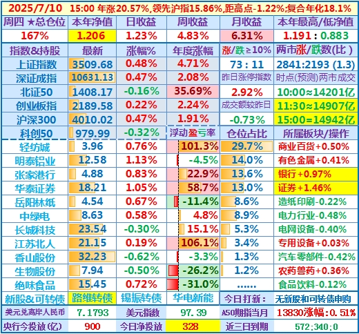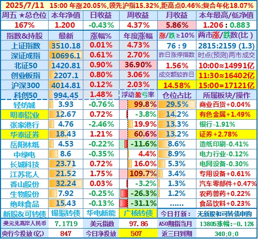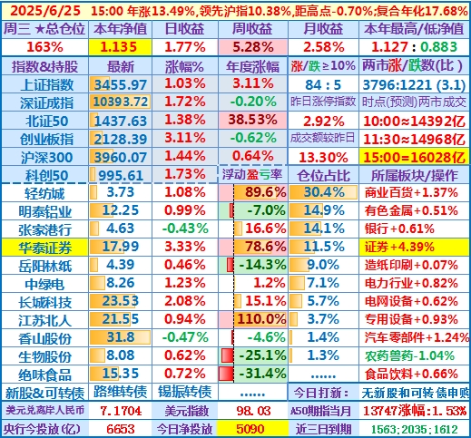 ★★操作(观察):继续持股,申购可转债……开盘15分钟,个股涨跌比3.6,两市成交额量级约2.0万亿,。华泰证券分红除权日:2024年度分配10派3.7元(含税)……10时,个股涨跌比3.5,两市成交额量级约2.04万亿……中午收盘,个股涨跌比5.1,两市成交额量级约2.11万亿。账户净值目前再创新高……收盘,个股涨跌比6.9,两市成交额2.24万亿。账户持股12涨1跌,仅张家港行下跌,今日大盘活跃,虽然昨天减了仓,但总仓位仍高,日盈利约昨天亏损绝对值的2倍,本年净值再创历史新高。有色金属板块大涨,一向表现平淡的明泰铝业难得大涨近7%,转变为第二重仓股……
