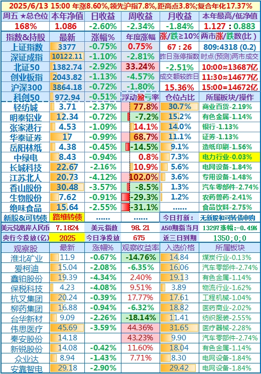 ★★操作:新股申购;重仓股大多涨幅小于1%,全部11只持股中下跌仅有两只……本周五长城科技将实施每股派现金红利1.50元,考虑近日逢高先出部分…… 表格修正几处:因鑫铂股份2025/1/22每10股派2元、保税科技2025/5/16每10股派0.30元,表格相应修正它们的观察收益率……观察股中的力诺药包创入选后新高……