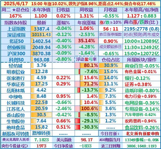 2025-05-19:本年净值1.102,日、周收益+0.77%,月收益+9.13%,年收益+10.18%,仓位157%……