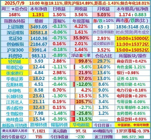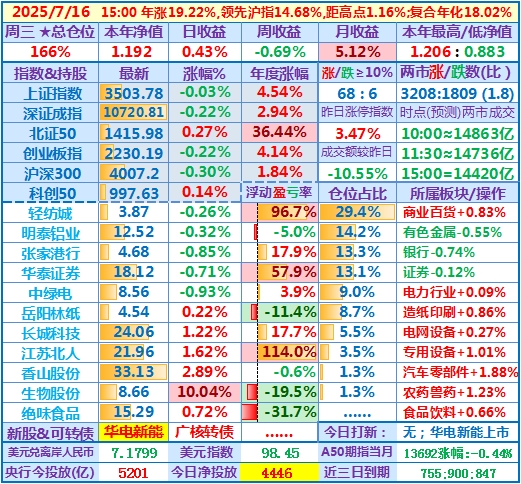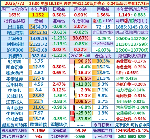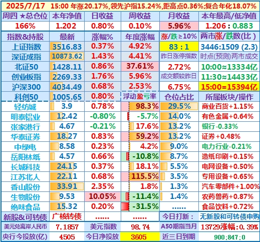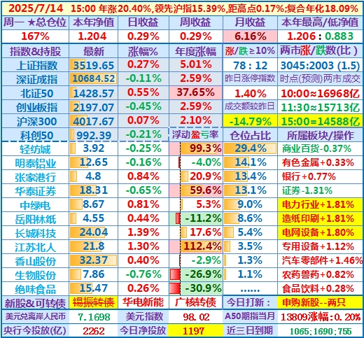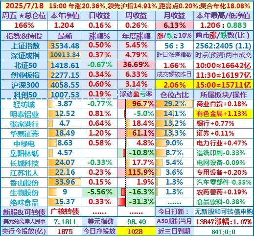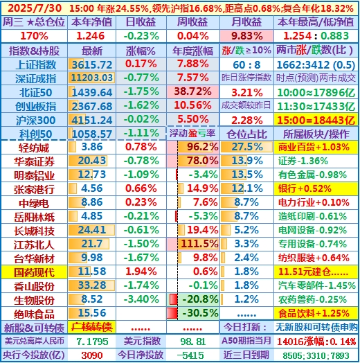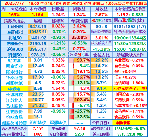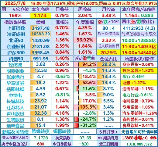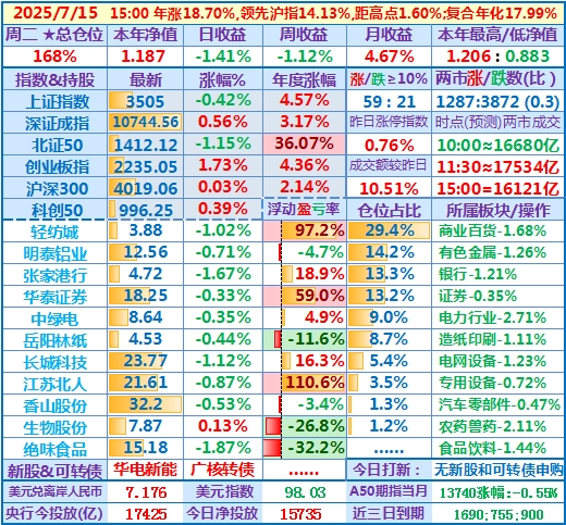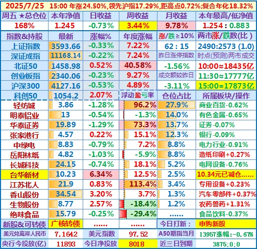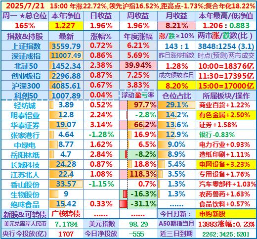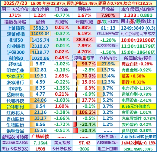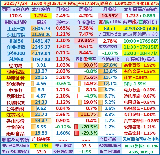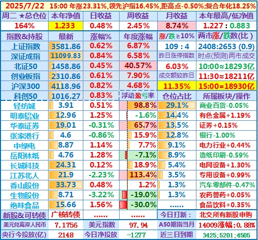 2025-07-23:本年净值1.224,日收益-0.77%,周收益+1.67%,月收益+7.90%,年收益+22.37%,仓位171%……