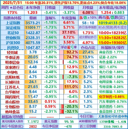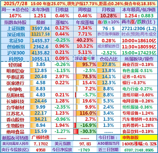 重现一下 2025-07-23当日的盘中思考摘要:……账户整体小涨,盘中再创历史新高,思考操作计划:只要没有大的风险,还是持股待涨,只因走势难料,只能靠运气,前期判断沪指将来3731点一般能过,不过感觉如果8月中旬那时账户收益仍很丰硕时,则开始需更谨慎些持仓了……