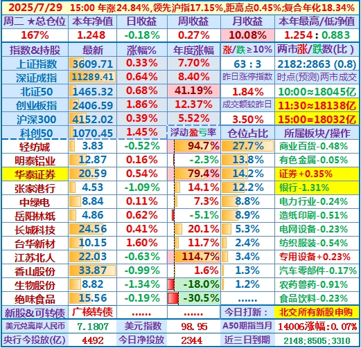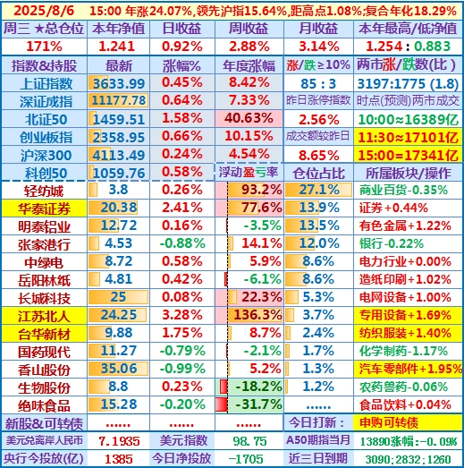 2025-08-06:本年净值1.241,日收益+0.92%,周收益+2.88%,月收益+3.14%,年收益+24.07%,仓位171%……
