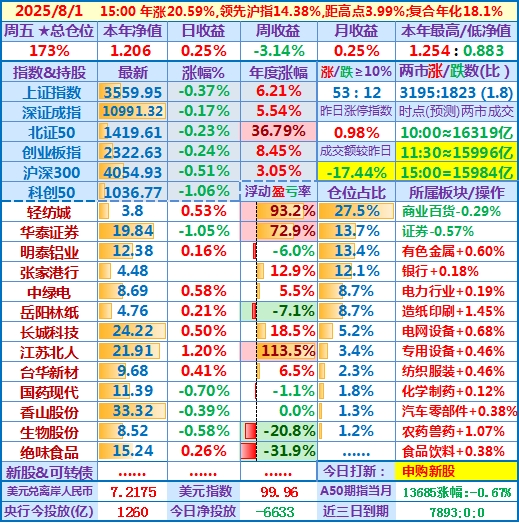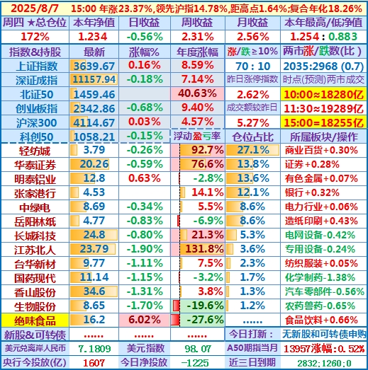 2025-08-07:本年净值1.234,日收益-0.56%,周收益+2.31%,月收益+2.56%,年收益+23.37%,仓位172%……
