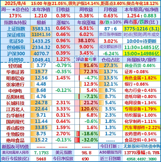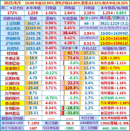 2025-08-05:本年净值1.229,日收益+1.56%,周收益+1.94%,月收益+2.19%,年收益+22.93%,仓位172%……