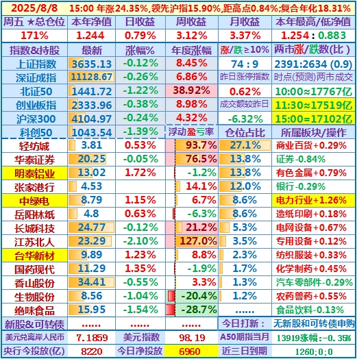 2025-08-08:本年净值1.244,日收益+0.79%,周收益+3.12%,月收益+3.37%,年收益+24.35%,仓位171%……