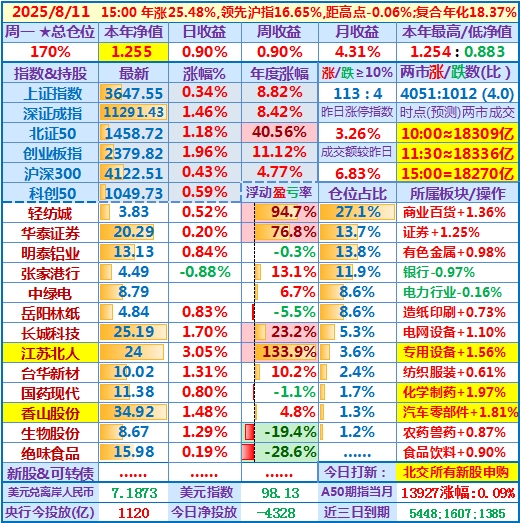 2025-08-11:本年净值1.255(本年/历史新高),日收益+0.90%,仓位170%……