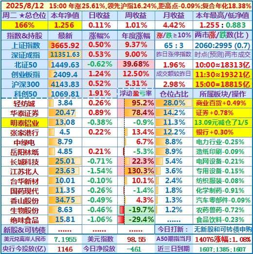 2025-08-12:本年净值1.256(本年/历史新高),日收益+0.11%,仓位166%(因减仓了明泰铝业)……