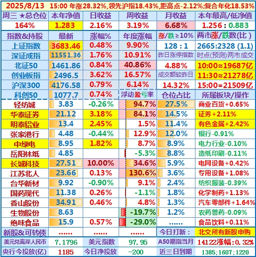 2025-08-13:本年净值1.283(历史新高),日收益+2.16%,仓位164%……