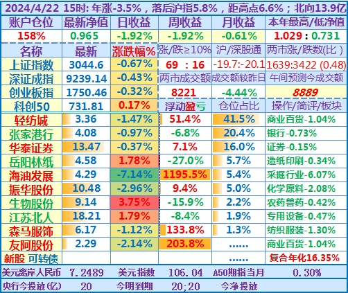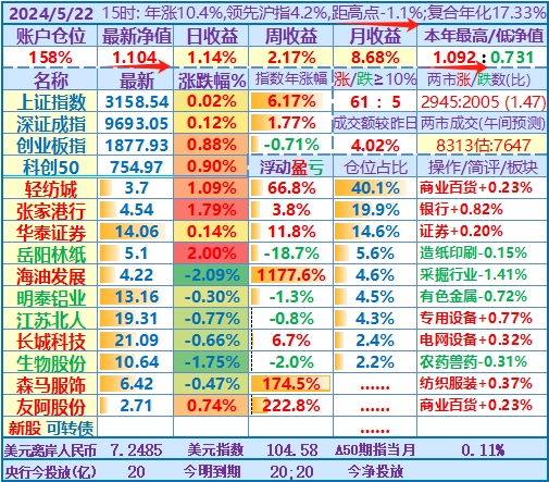 2024-11-04:本年净值1.228,日收益+3.25%,年收益+22.76%,仓位149%……