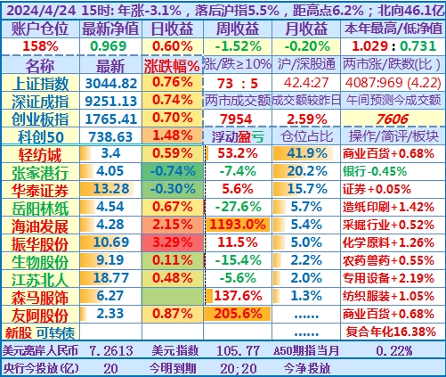 ★★操作:无;重仓三只个股仅微涨,全靠江苏北人、岳阳林纸等,使今天账户涨幅超过大盘涨幅……