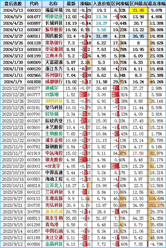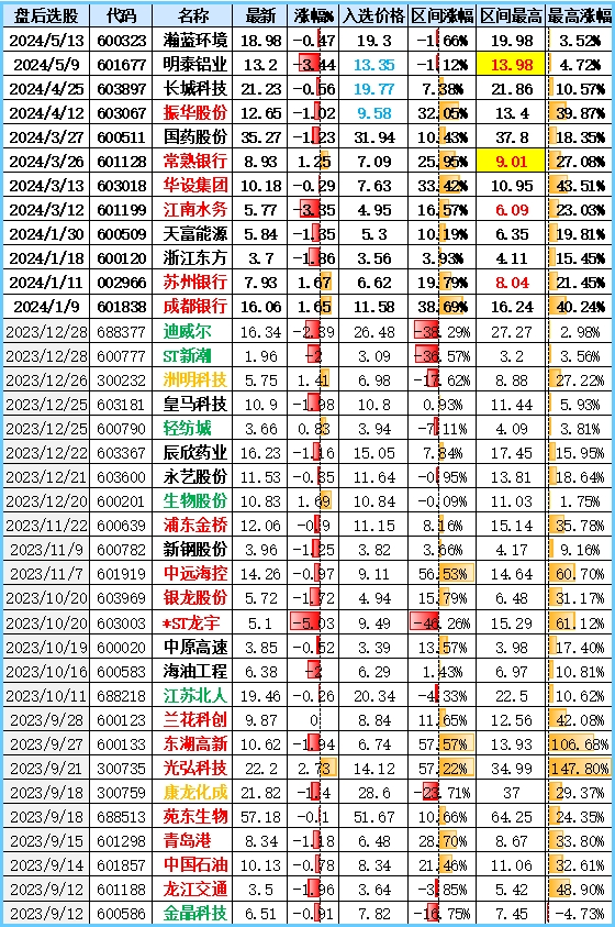 ★★操作:无……持股中岳阳林纸今日继续领涨,明泰铝业跌幅居前,银行股疲弱,证券股略强……观察股中的没有股票在今日盘中创出入选后新高,周一收盘后入选的预备的观察股有友食品近两日强势……