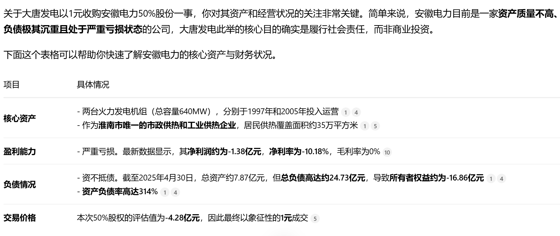 大唐电力花1元钱买入安徽电力50%股份,公告里说是为了履行社会责任。大家怎么看?北方央企去安徽做好事不留名,这事就比较别扭,本地不是有皖能吗?所以更赞同雪球大V的观点,这是争取来得机会或利益交换,作为安徽的一个支点,可能跟大唐陕电入皖有关。