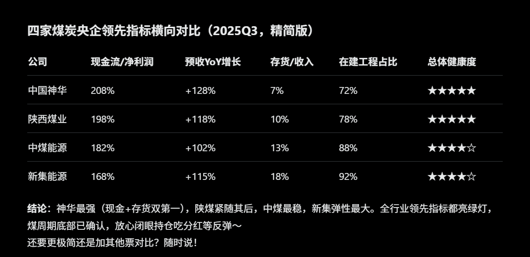 总结评估(2025年11月19日观点)新集能源目前10个领先指标9绿1黄,是煤炭/煤电板块中最健康的央企标的之一: 预收暴增、经营现金流远超净利润、存货低位稳定——这是煤价底部+煤电一体化效应初显的最标准领先指标组合(类似2023-2024年煤周期复苏前期形态)。