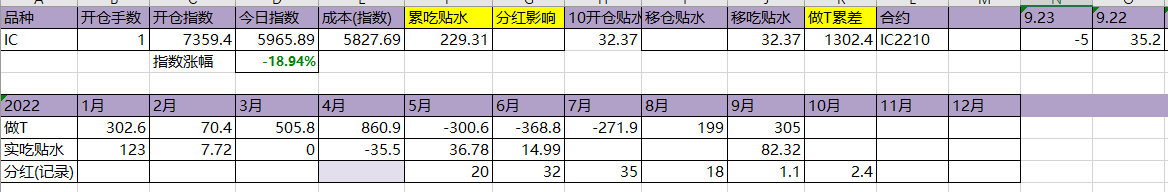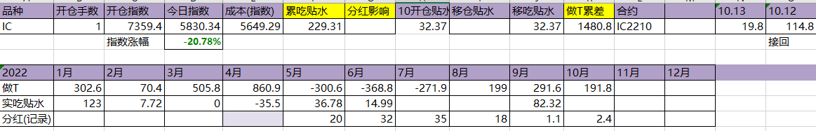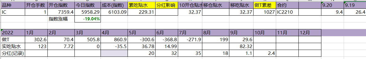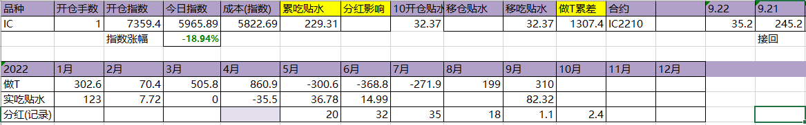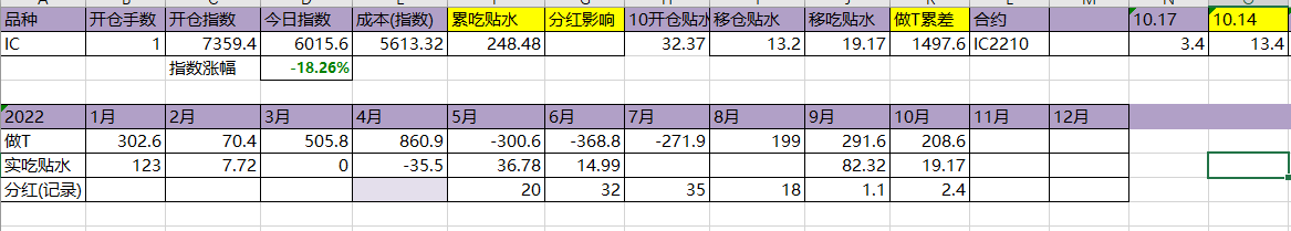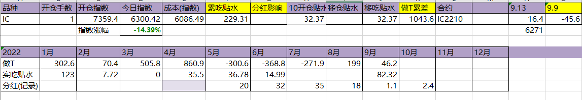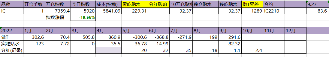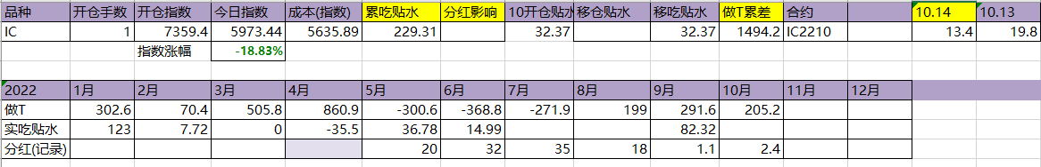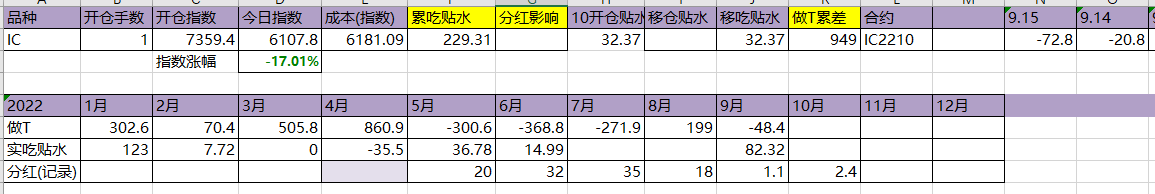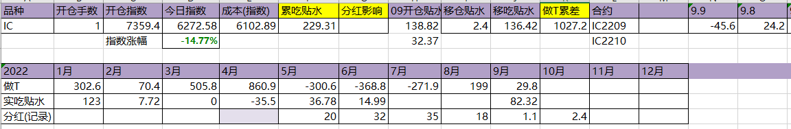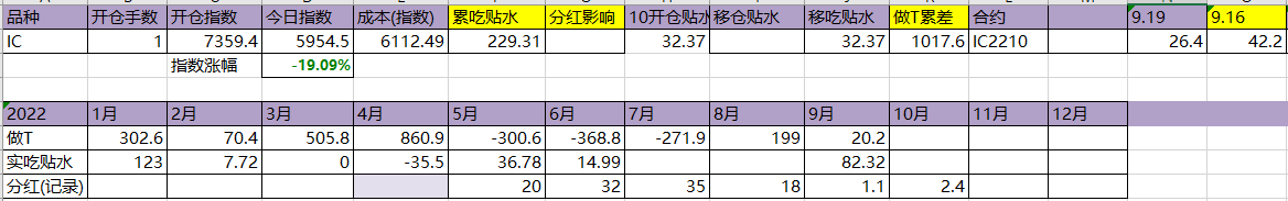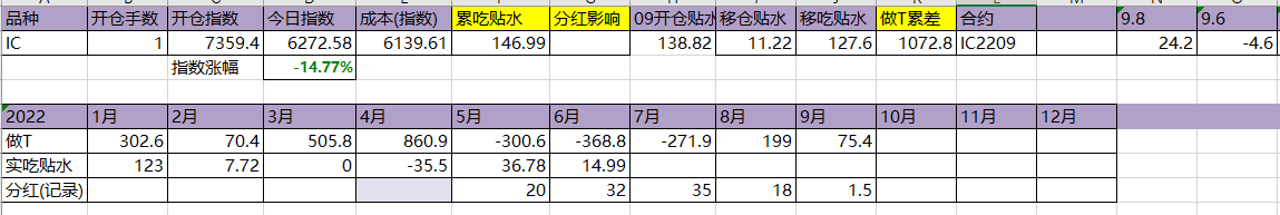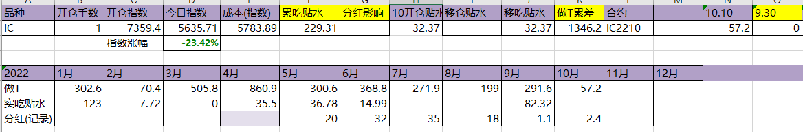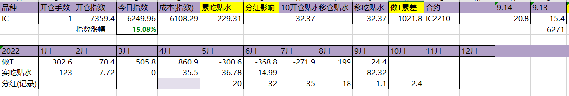 今天T飞了,资金今天硬杠,盘面还是被杠起来了。吃贴水移仓到10合约,虽然这个移仓并没有什么用。今年实际吃到贴水229点,估计总共可以吃320点,相较于年初7359点,贴水实际贡献4.35%,今天贴水收益很一般,聊胜于无吧。