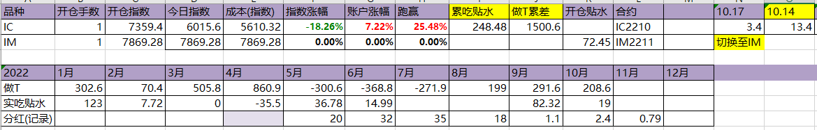 今天尾盘,把IC切换到了IM,IC的吃贴水阶段正式结束了。10个月,吃了248点贴水,做T 1500点,经历了这个严酷的熊市,账户勉强还有点盈利。应该说,熊市中吃贴水还是不太现实,区区250点的贴水,真的不太顶用。大A股,不择时是不行的,巴菲特来都不行,这也是中国特色股市的特点,谁都没法逃避。