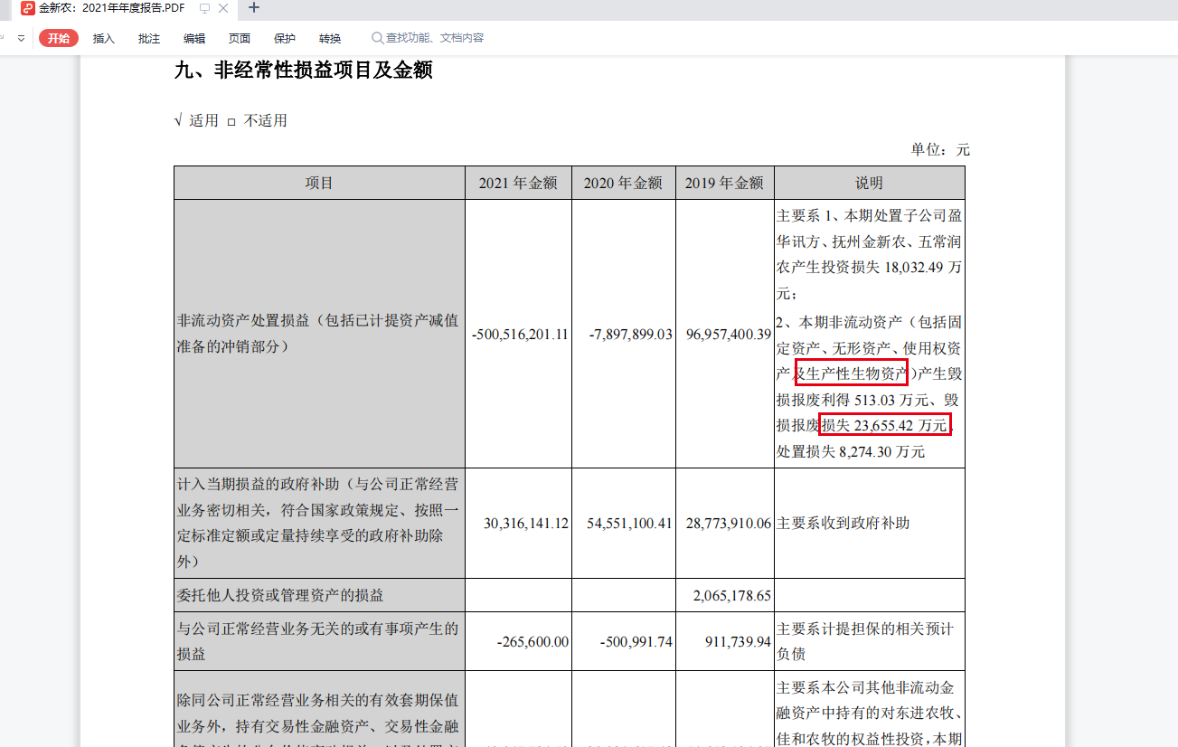 2020年增发7个亿,利润1.32e,21年亏损10e,把过去n年的利润亏光了。股东净资产20e,资产总额60e。杠杆很高。金新农把生物性资产的毁损。列入非经常性损益,不太厚道,有误导性。