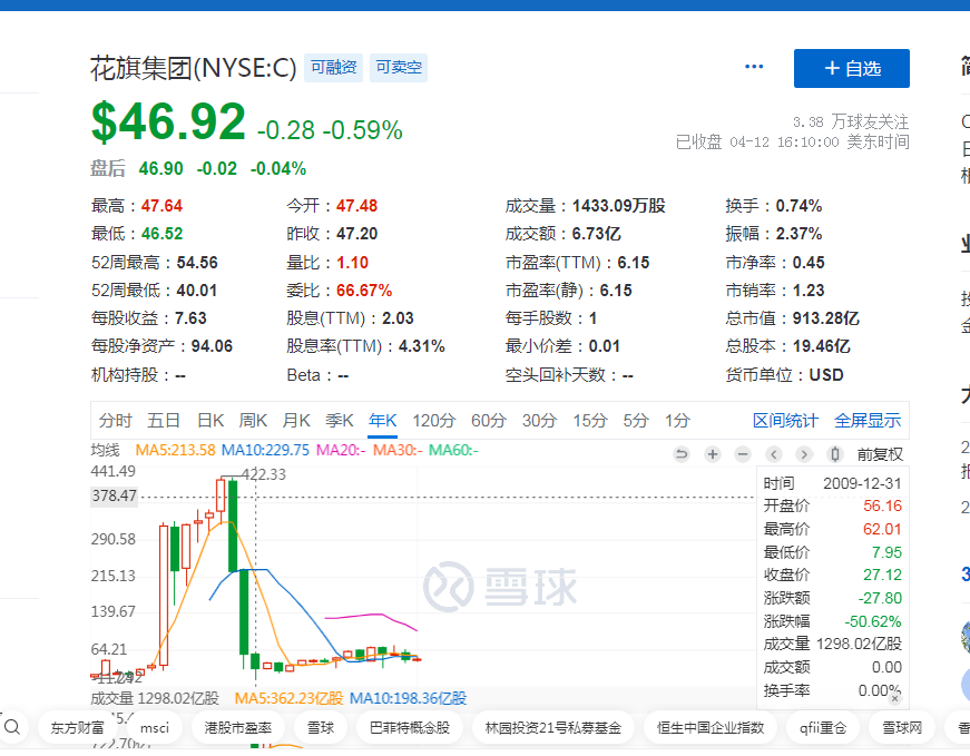 后来花旗银行股价从pre-ciris的422美元,跌倒最低的7.85。