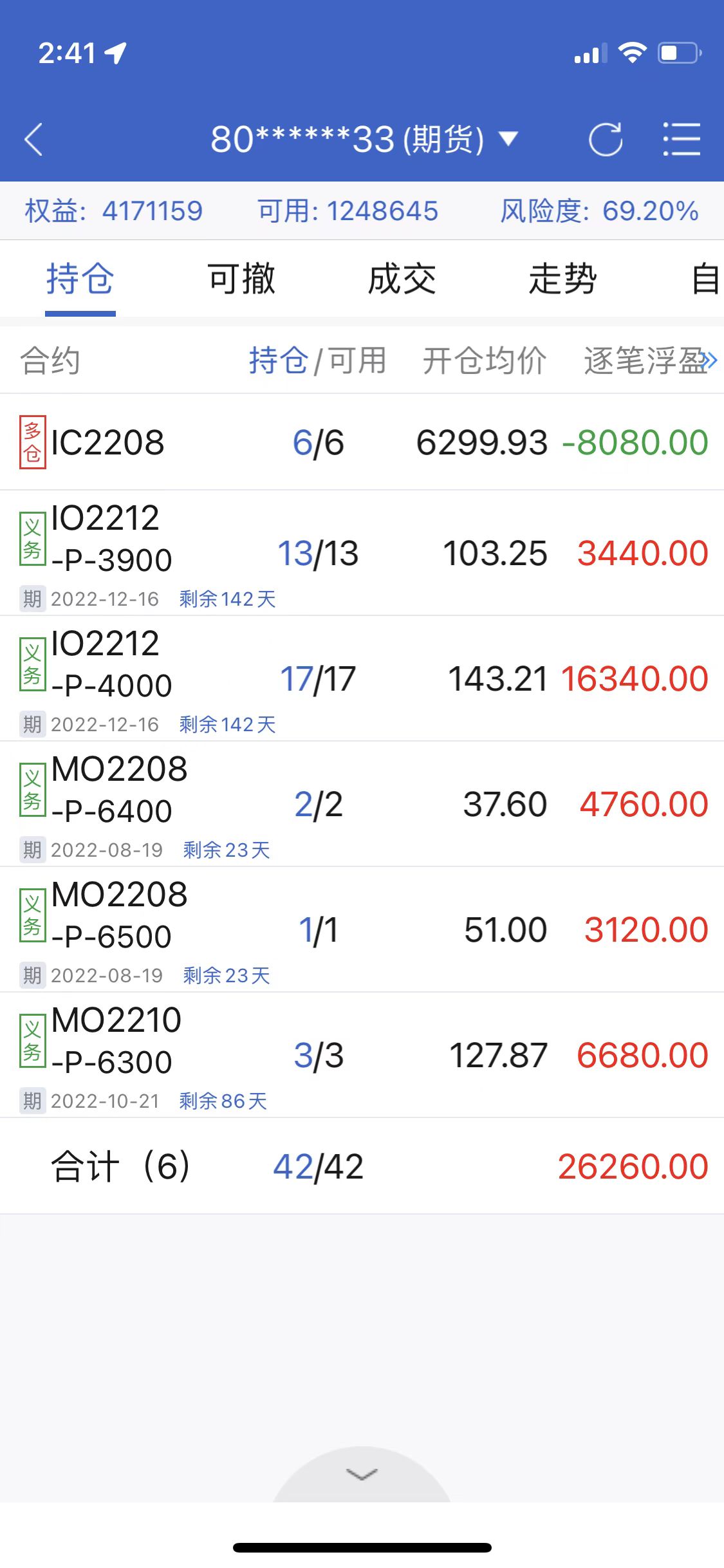 还有90万对应的理财到期会陆续转入期指账号,差不多权益对应期指是1.5倍杠杆。后期卖权30手IO准备长期滚,MO虽然波动率大权利金更高,但不好锚定点位所以不会长期上仓位滚,有可能就弄个2-3手滚一下。