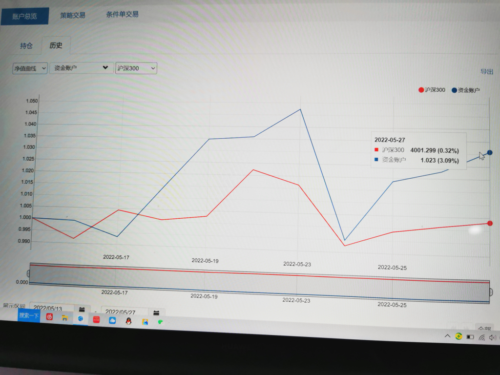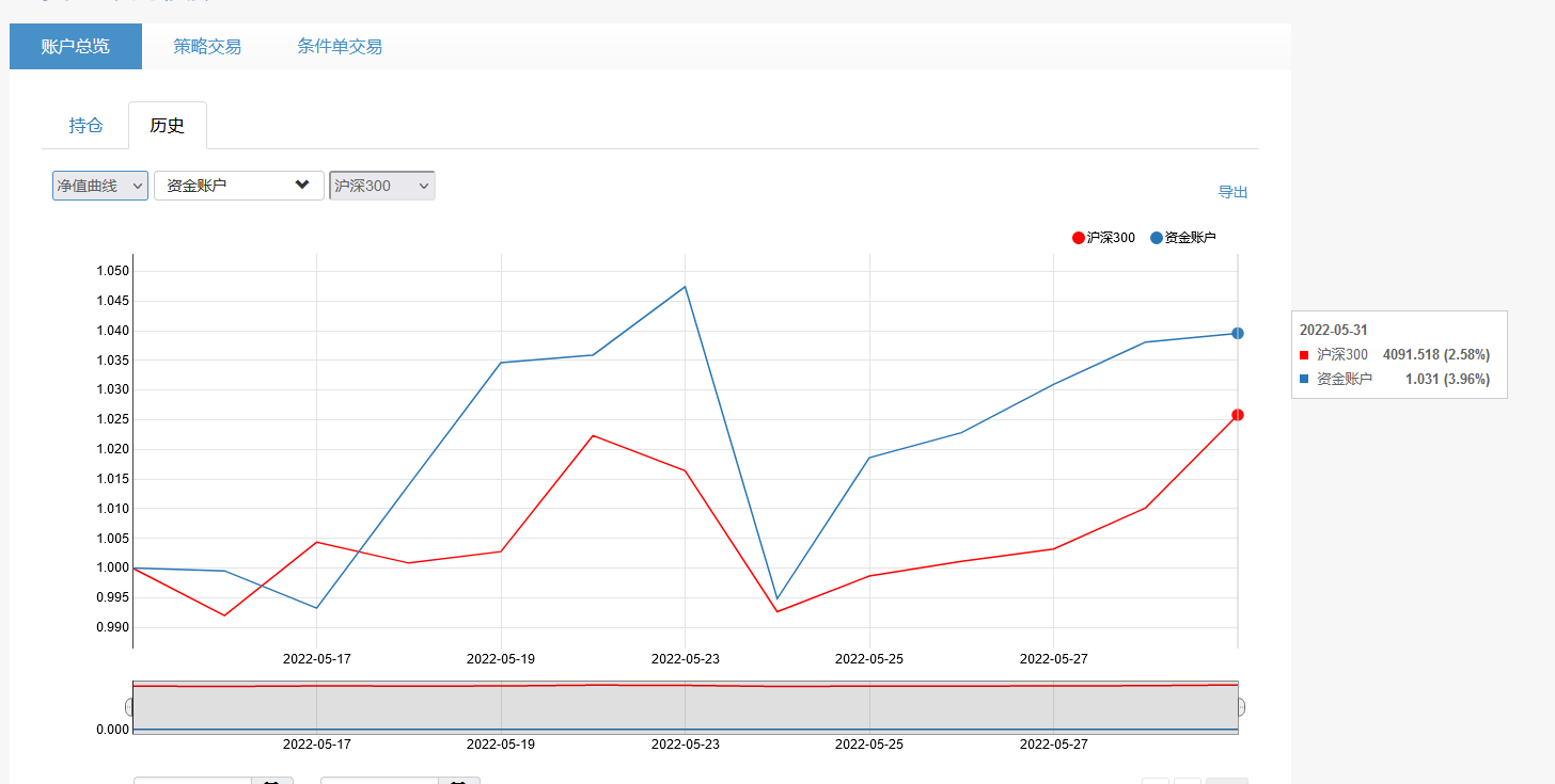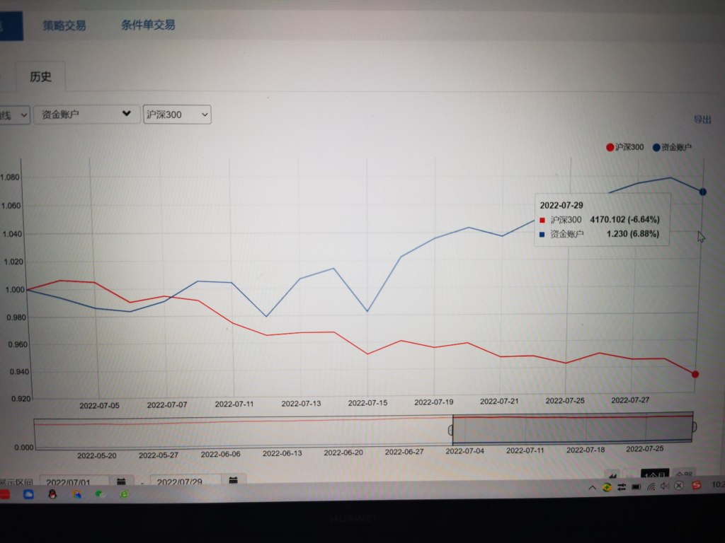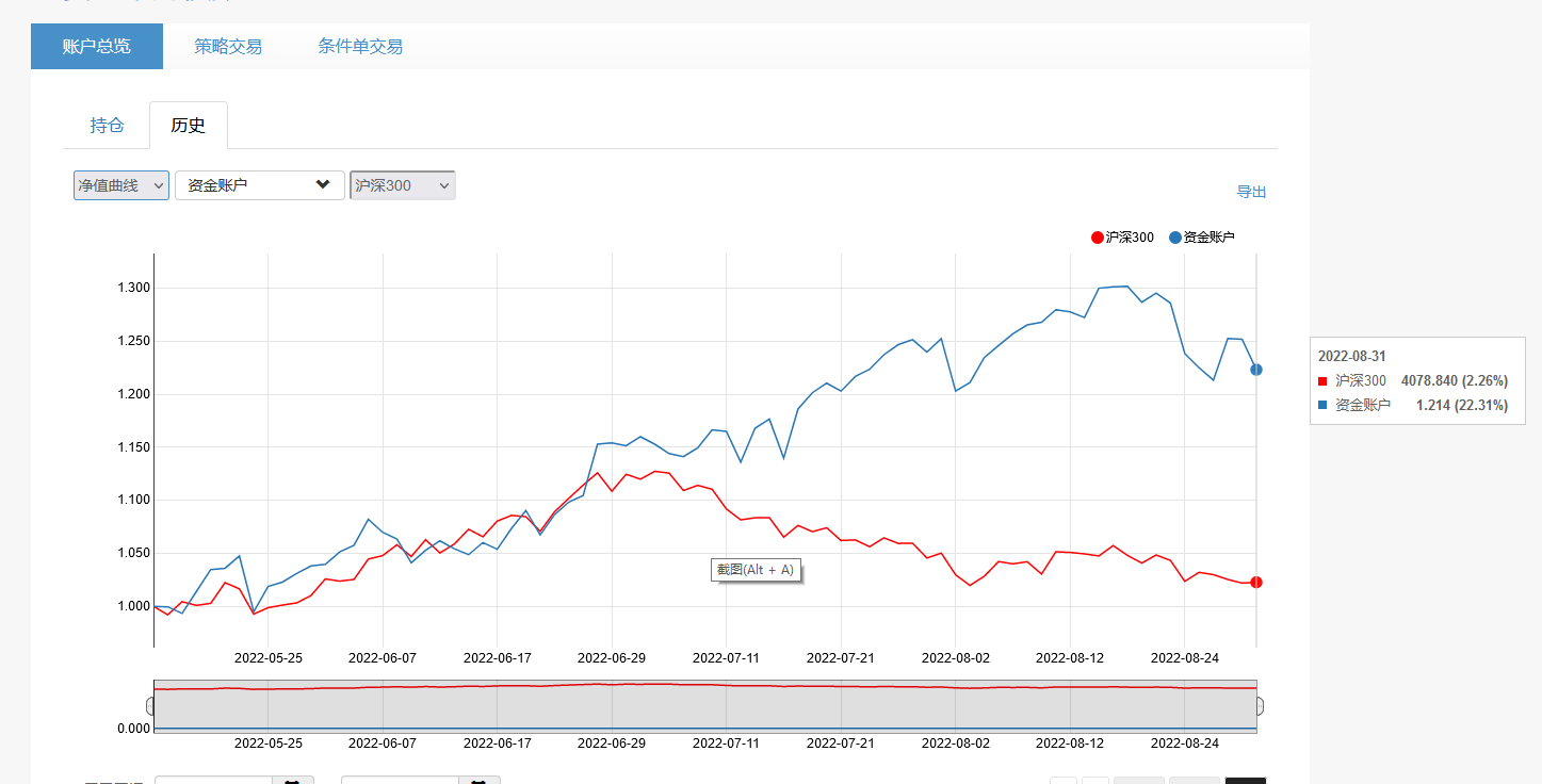 策略自5月13日运行至今一共3个半月,收益为22.31%,相比沪深300的2.19%收益,简直就是碾压。目前已经安排一部分实盘跟进了,看看什么效果。