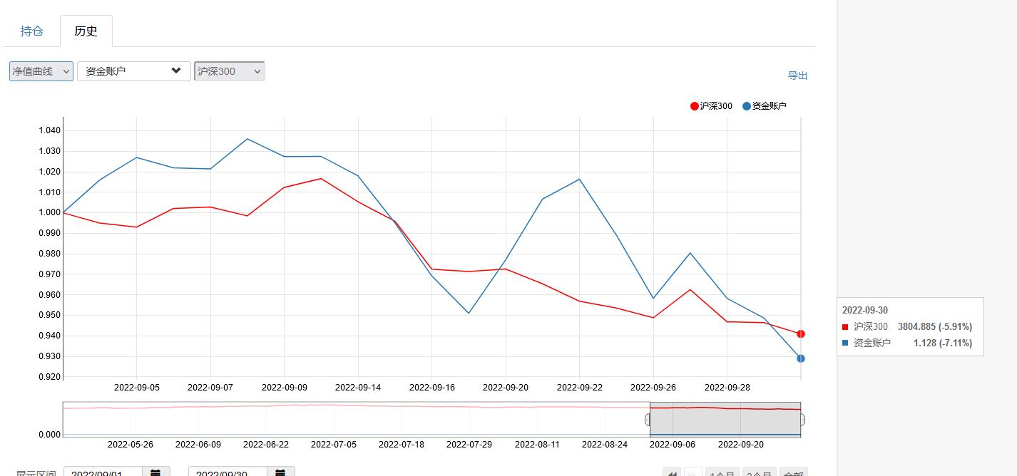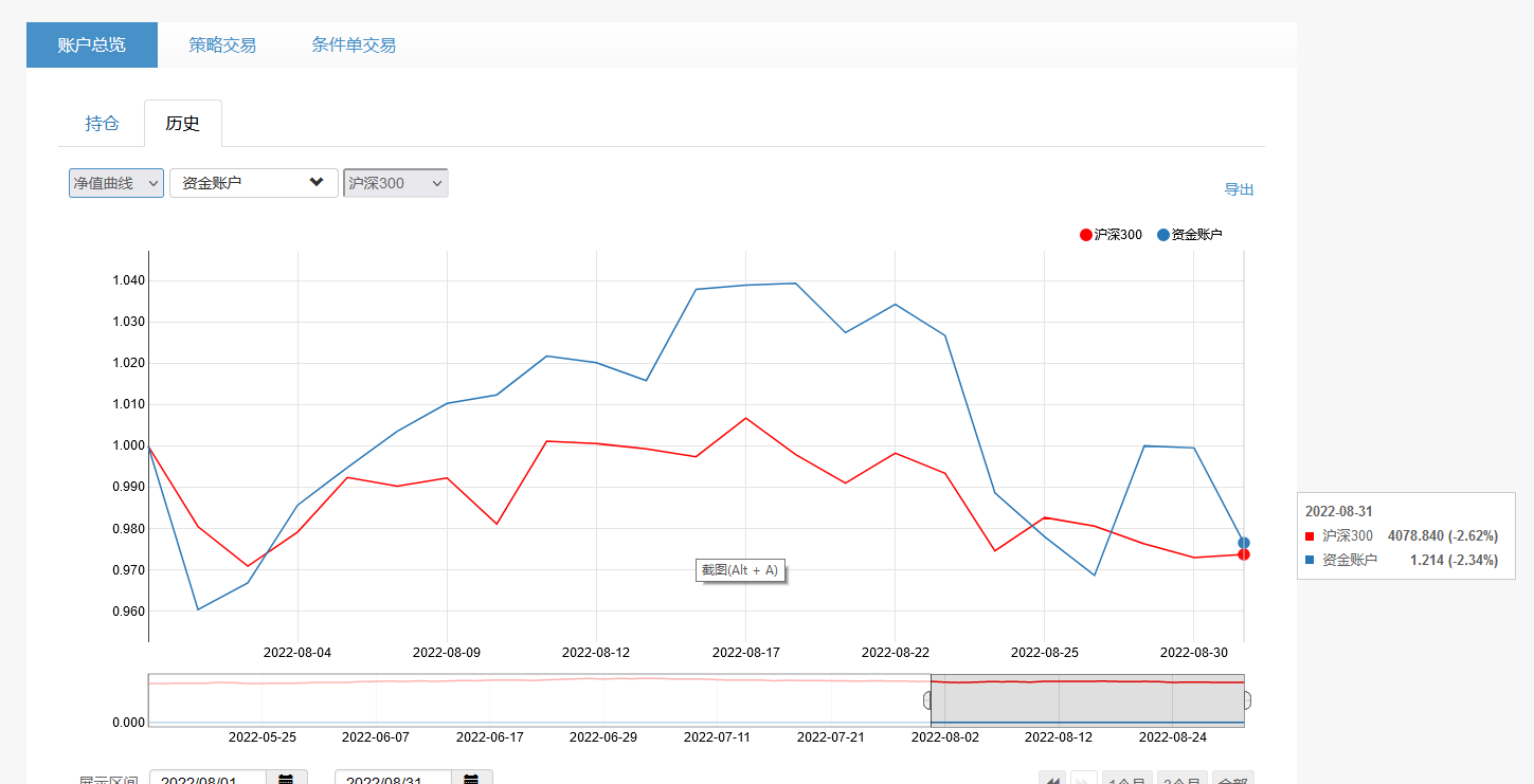 受众所周知的一些8月份特发情况及毛大师捣乱,本月的策略居然跑出了负收益出来,真是惭愧,8月收益-2.34%,相比起沪深300的-2.62%收益,还是跑赢了,唯一的欣慰了。