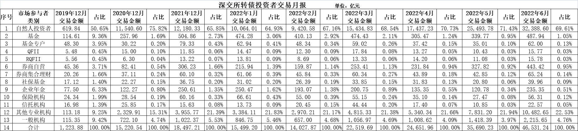 2022年6月,深交所转债投资者交易金额46,531.24亿元,其中基金(公募)交易金额占比1.05%,其他专业机构(私募)交易金额占比22.53%,自然人投资者交易金额占比69.61%。