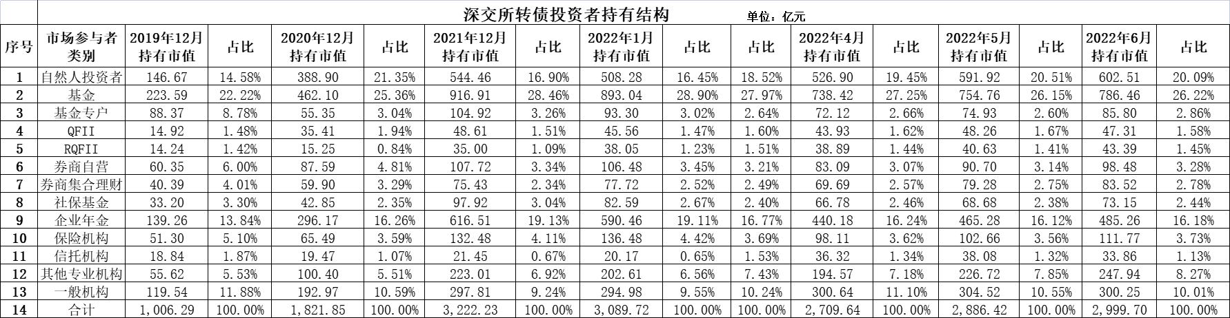 2022年6月,深交所转债投资者持有市值(债券市值)2,999.70 亿元,其中基金(公募)持有市值占比26.22%,其他专业机构(私募)持有市值占比8.27%,自然人投资者持有市值占比20.09%。