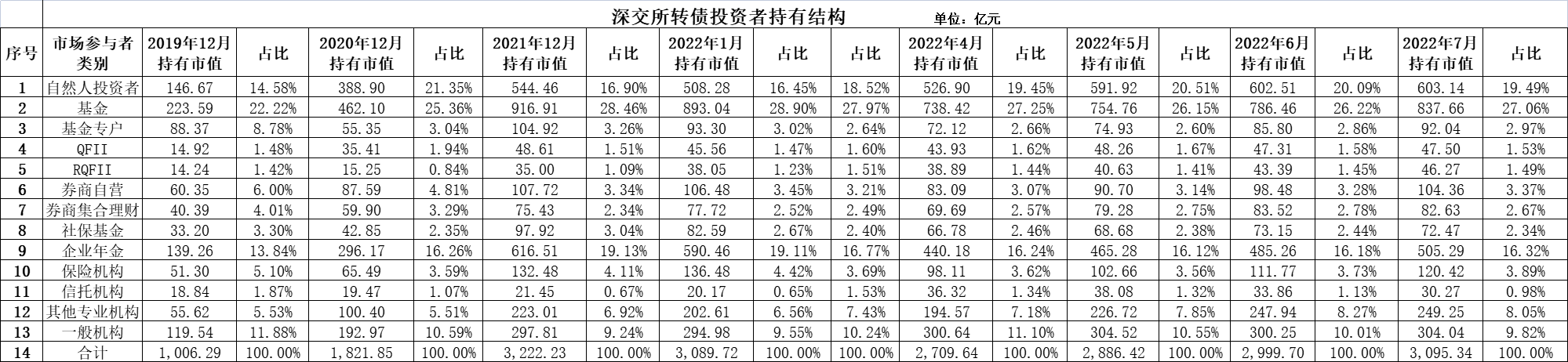 2022年7月,深交所转债投资者持有市值(债券市值)3,095.34 亿元,其中基金(公募)持有市值占比27.06%,其他专业机构(私募)持有市值占比8.05%,自然人投资者持有市值占比19.49%