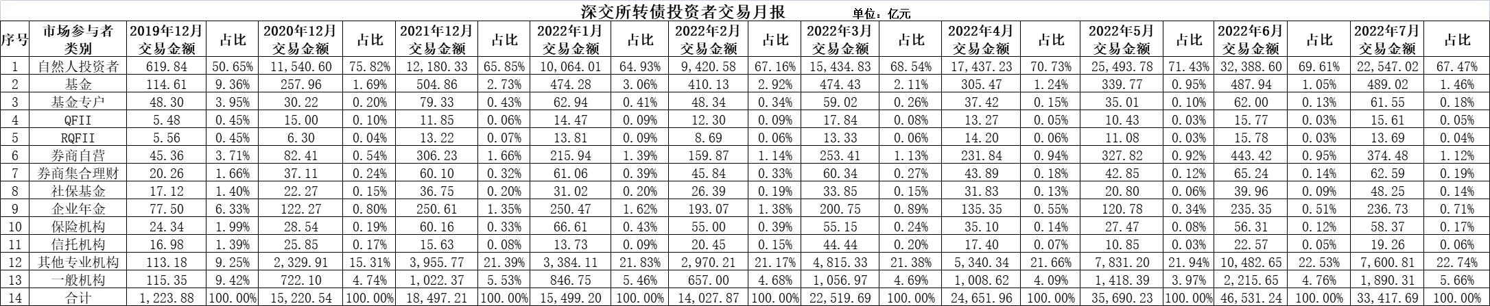 2022年7月,深交所转债投资者交易金额33,417.69亿元,其中基金(公募)交易金额占比1.46%,其他专业机构(私募)交易金额占比22.74%,自然人投资者交易金额占比67.47%
