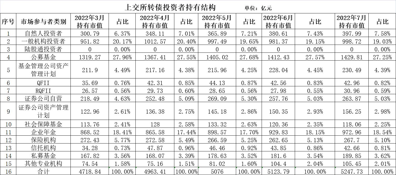 2022年7月,上交所转债投资者持有市值(债券面值)5247.73亿元,其中公募基金持有市值占比27.25%,自然人投资者持有市值占比7.58%。