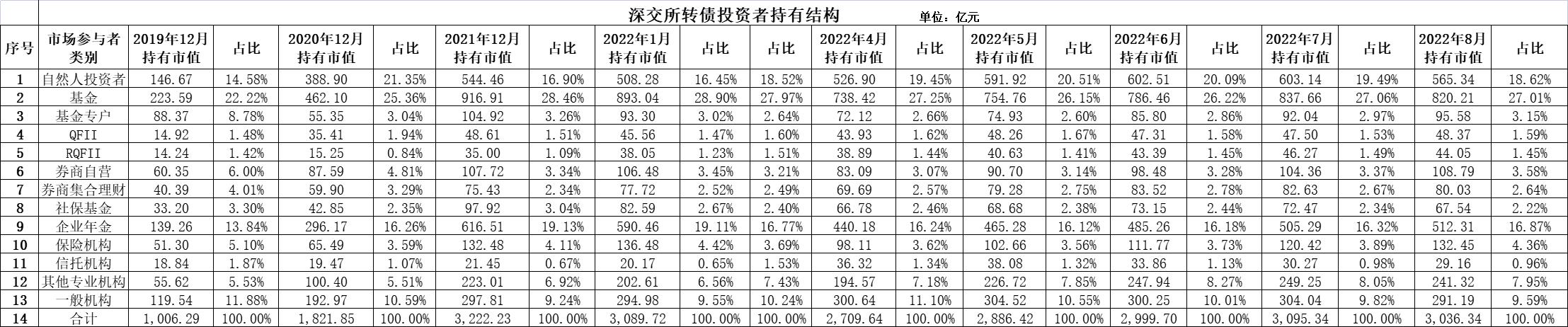 2022年8月,深交所转债投资者持有市值(债券市值)3,036.34 亿元,其中基金(公募)持有市值占比27.01%,其他专业机构(私募)持有市值占比7.95%,自然人投资者持有市值占比18.62%。