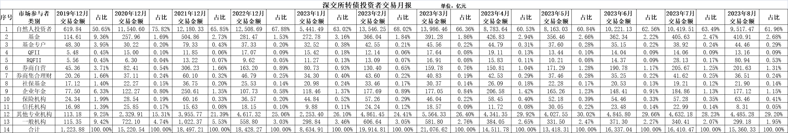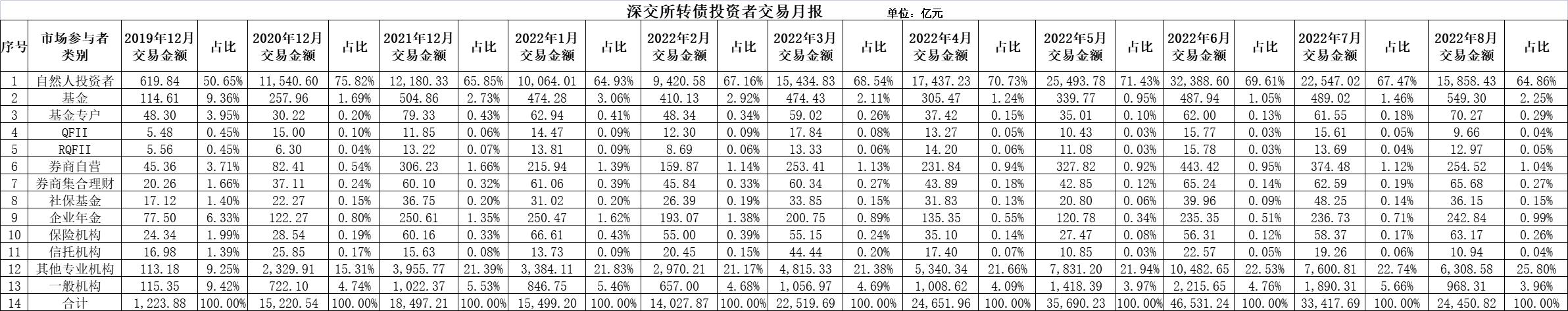 2022年8月,深交所转债投资者交易金额24,450.82亿元,其中基金(公募)交易金额占比2.25%,其他专业机构(私募)交易金额占比25.80%,自然人投资者交易金额占比64.86%。