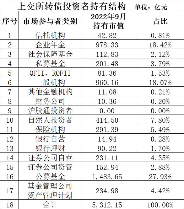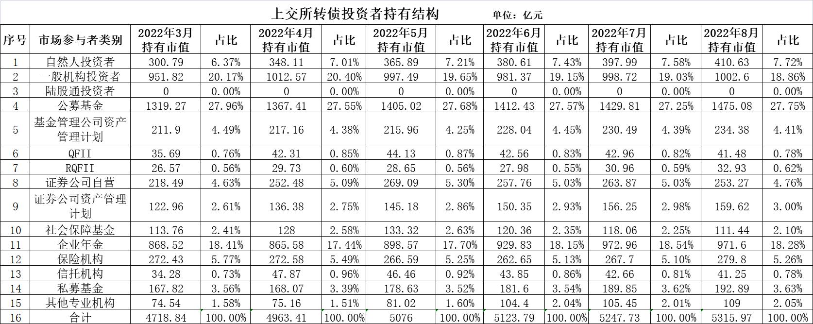 2022年9月,上交所转债投资者持有市值(债券面值)5,312.15 亿元,其中公募基金持有市值占比27.93%,自然人投资者持有市值占比7.80%。